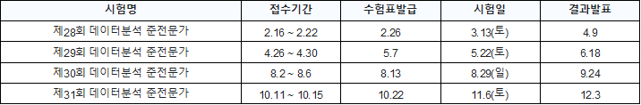 시험 일정은 데이터자격검정(www.dataq.or.kr) 홈페이지에서 확인 가능합니다.
