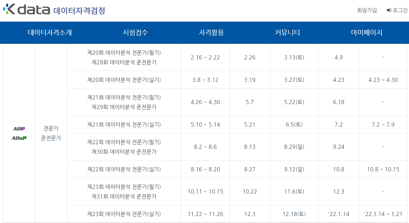 ADP(데이터분석전문가) 시험일정과 함께 나와있습니다. ADP의 경우 필기/실기로 시험이 나뉘지만 ADsP의 경우 필기만 있습니다.