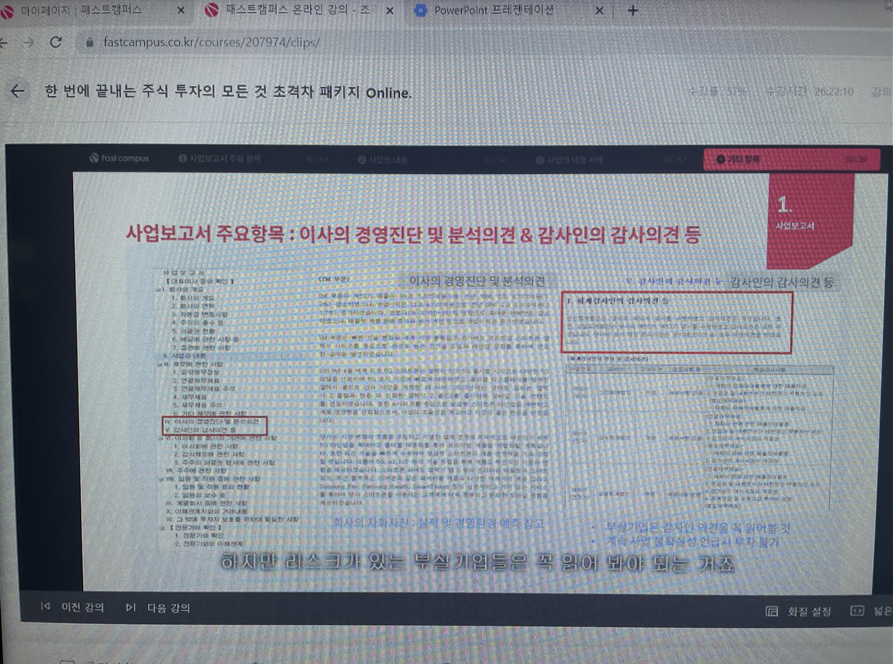 사업보고서를 통해 투자 기업의 사업 내용을 알고, 향후 있을 수 있는 리스크 및 설적 개선 등의 기회를 확인하는 방법을 배웠다