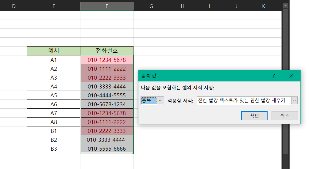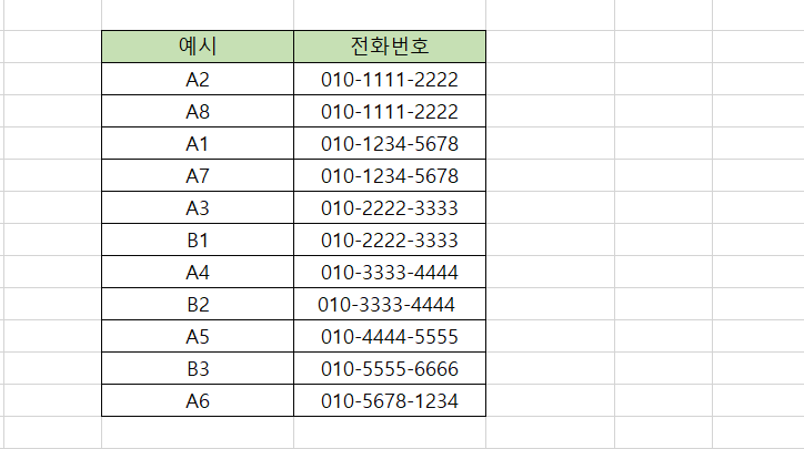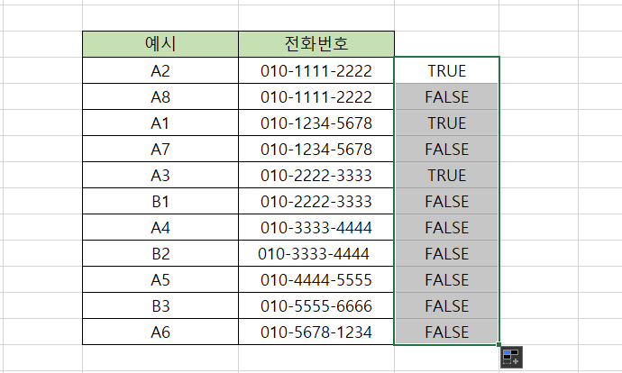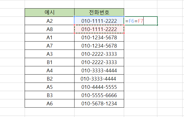 다만, 아래 이미지를 보시면 A4와 B2는 전화번호가 동일하지만 중복값으로 인식하지 못했는데요.