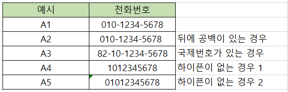 단, 하이픈을 그냥 제거할 경우 아래 예시 중 A4와 같이 번호 앞 "0"이 사라지기 때문에,
