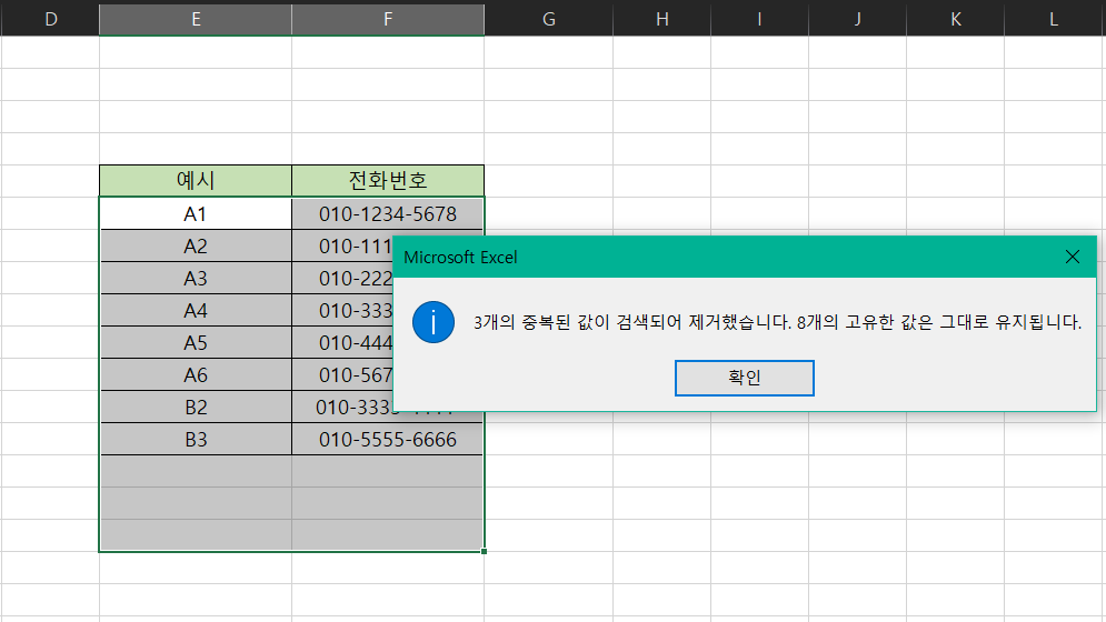 중복 값 제거 창에서 중복 값이 있는 열(예시에서는 '전화번호'입니다)을 선택하면 바로 중복값이 삭제된 데이터를 볼 수 있습니다.