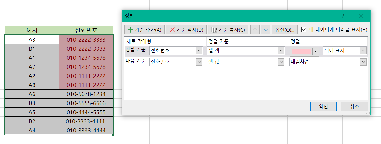 셀 색으로 정렬하여 중복값을 위로 모아두고, 셀 값을 기준으로 내림차순하면 서로 중복된 데이터를 확인할 수 있습니다.