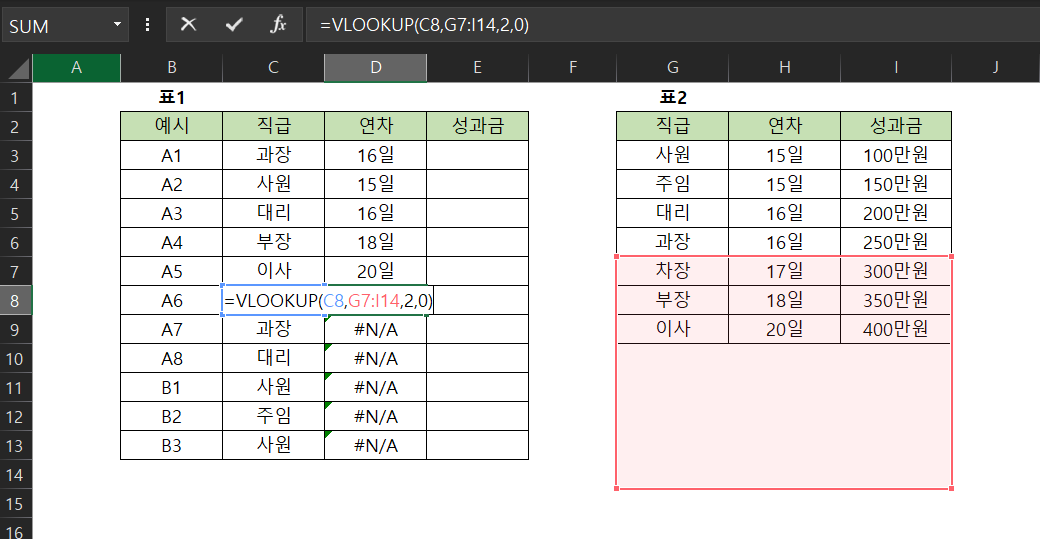 표 1에서 A1의 직급이 "과장"이니, 표2에서 "과장"에 해당하는 연차(16일)와 성과금(250만원)을 찾아 넣어야 합니다.